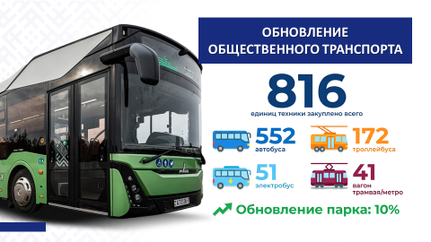 Развивается транспортное сообщение. Организациями транспорта общего пользования осуществляется обновление подвижного состава. Только в 2025 году во всех регионах республики закуплено 816 единиц городской пассажирской техники: 552 автобуса, 172 троллейбуса, 51 электробус, 41 единица вагонов трамваев и метро. В целом по республике процент обновления подвижного состава городского общественного транспорта в 2026–2030 гг. прогнозируется ежегодно около 10%.