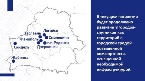 В 2026–2030 гг. будет продолжено развитие 8 городов-спутников в Брестской (г.Жабинка), Гродненской (г.Скидель), Минской (города Дзержинск, Заславль, Логойск, Смолевичи, Фаниполь, г.п.Руденск) областях как территорий с городской средой повышенной комфортности, оснащенных необходимой инфраструктурой.