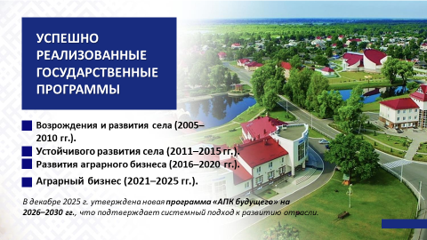 За 20 лет по инициативе Главы государства А.Г.Лукашенко в Беларуси реализована серия госпрограмм по развитию сельских территорий, агропромышленного комплекса: Государственная программа возрождения и развития села на 2005–2010 гг.; Государственная программа устойчивого развития села на 2011–2015 гг.; Государственная программа развития аграрного бизнеса в Республике Беларусь на 2016–2020 гг.; Государственная программа «Аграрный бизнес» на 2021–2025 гг. А в декабре 2025 г. была утверждена еще одна масштабная Государственная программа «АПК будущего» на 2026–2030 гг. Это свидетельствует о последовательности в развитии агропромышленного комплекса страны.